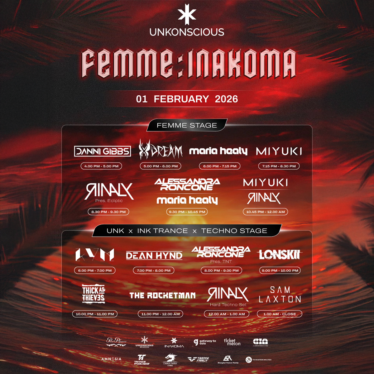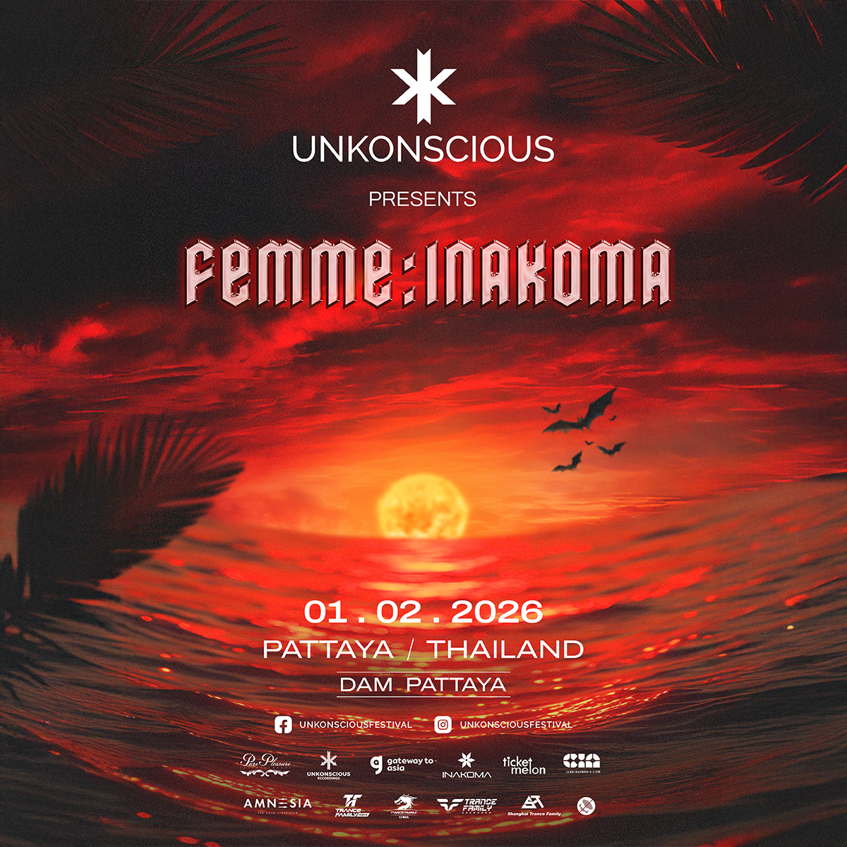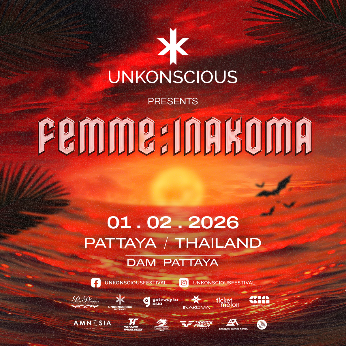 February 2nd, 2026 UnKonscious After Party คืนวันอาทิตย์ปิดสัปดาห์เทศกาลด้วยค่ำคืน FEMME: INAKOMA ที่ DAM พัทยา ต่อเนื่องจากบรรยากาศของงานหลัก สู่พื้นที่คลับที่เข้มข้นและใกล้ชิดมากขึ้น ดนตรีจะค่อย ๆ ไหลจากช่วงเย็นไปจนถึงเที่ยงคืน โดยวางจังหวะของค่ำคืนให้ค่อยเป็นค่อยไปและรักษาแรงกดดันบนฟลอร์อย่างต่อเนื่อง