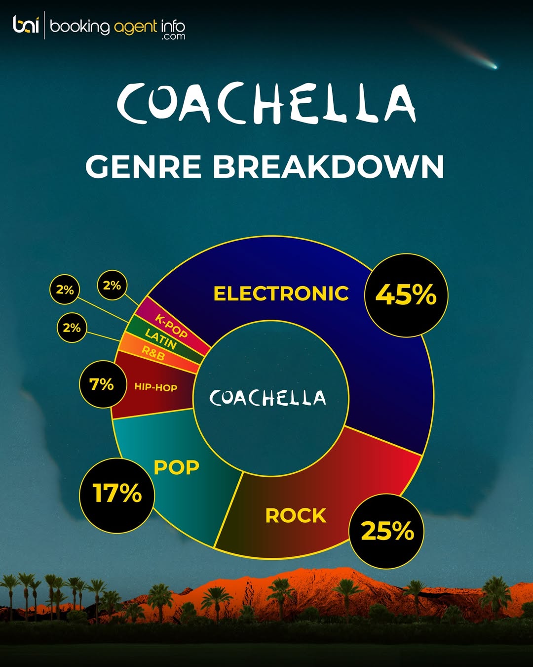 Electronic music now comprises 45% of the Coachella 2026 lineup, up from 39% in 2025, according to data from Booking Agent Info. That makes it the highest share electronic music has ever held at the festival, and the second consecutive year it has claimed the top genre spot.